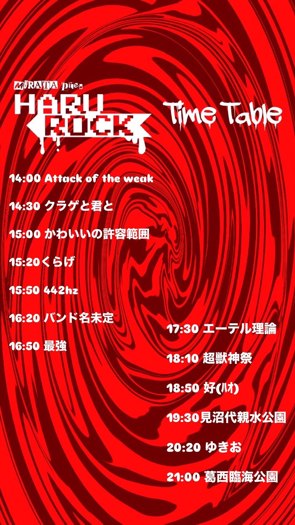 attack of the weak / クラゲと君と / かわいいの許容範囲 くらげ / 442hz / バンド名未定 / 最強 / エーテル理論 好(ハオ) / 見沼代親水公園 / ゆきお / 葛西臨海公園
